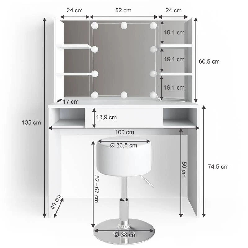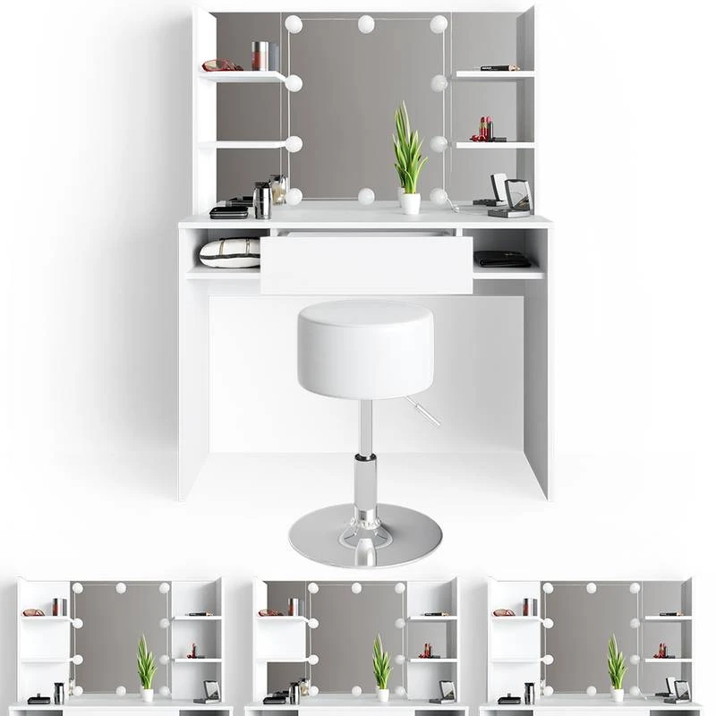- Contenu de la livraison : • 1x coiffeuse avec 6x miroirs autocollants • 1x tabouret design • 1x guirlande lumineuse LED à 10 boules Décoration non incluse